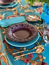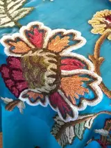 Natuurlijk zijde organza tafelkleed, zonder enige vorm van menging, een stof van uitzonderlijke kwaliteit, waarop exotische takken en bloemen met de hand zijn geborduurd in winterse kleuren.
