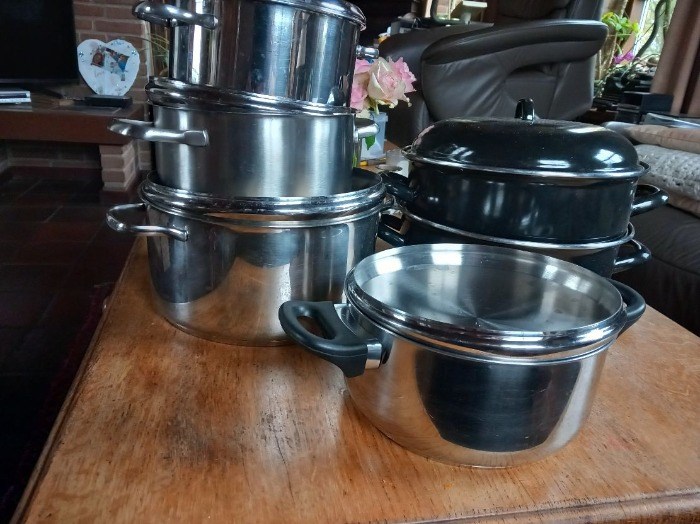 pannenset - marindex- 4 pannen, 25 -20(2) -19 cm- 2 braadpannen, 28 cm- 1 steelpan 17cm.- 1 vergiet- alles is i.p.st. 97,50