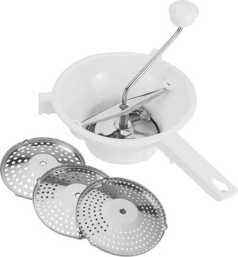 - Deze passeerzeef , is ideaal voor de bereiding van verse puree, sausen en soep. De 3 verschillende roosters zijn gemaakt van RVS en de molen van kunststof. Ze kunnen gemakkelijk omgewisseld worden, en ze geven elk een verschillende dikte en textuur aan je bereiding. Ze zijn makkelijk te demonteren en de losse roosters zijn afwasbaar in de vaatwasser.