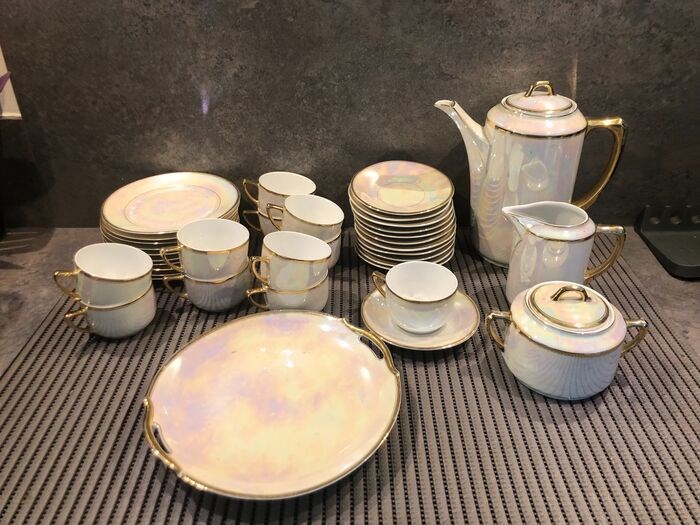 Koffiezetapparaat, suikerpot, melkkan, taartschaal, 11 kopjes en 12 schotels, parelmoerkleur, gouden rand, in perfecte staat, inklaringsbelasting ten laste van de koper