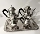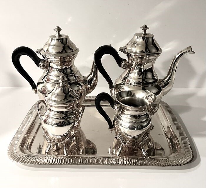 Vijfdelig thee- en koffieservies. Een dienblad (37 x 27cm) Een koffiepot (25 x 23cm) Een theepot (24x 22 cm) , Een suikerpot met deksel (16x 10cm) Een “verseuse” (11x 12cm).