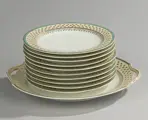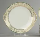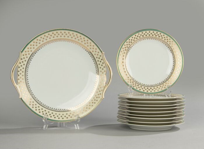 Prachtige set porseleinen cake / gebakservies van het Franse merk Raynaud Limoges. Het servies is gedecoreerd met ivoorkleurige brede randen, een smal groen randje en goudkleurige accenten. De samenstelling van de set is als volgt: