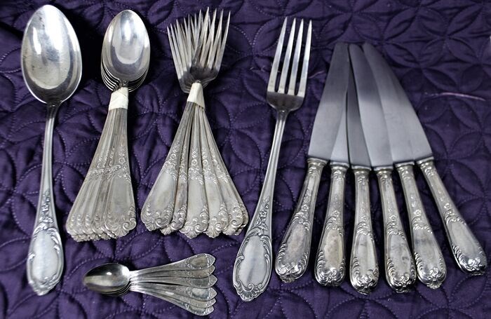 Tafelbestek in 800 massief zilver, "Venetiaanse achttiende eeuw" stijl voor 6 personen geproduceerd door een van de beroemdste zilverwerk in Palermo bestaande uit: