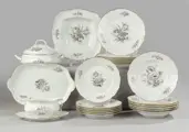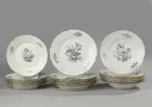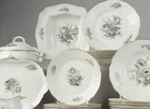 Prachtig porseleinen tafelservies voor zes personen van het Duitse merk Rosenthal, van de serie Sanssouci Grey Rose. Het porselein is van een prachtige kwaliteit, zeer verfijnd. De samenstelling van de set is als volgt: