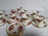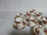 Mooie set van 9 kop en schotels en 6 petit four schaaltjes van Royal Albert.Het gaat om de serie Old Country Roses.Het zijn 8 kleine en 1 grote kop en schotels. De petit four schaaltjes hebben een diameter van q0 cm.