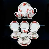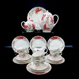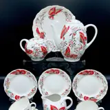 Fantastische en zeldzame Russische Lomonosov porseleinen koffie- en woestijnset met rode vlinders, 22 K goud geverfd porselein. Dit is een zeer complex patroon genaamd "Red Butterfly" met 22 stuks voor thee en snoep, met kopjes in de vorm van een tulp, ontwerper S.Yakovleva en schilder L.Grigorieva.