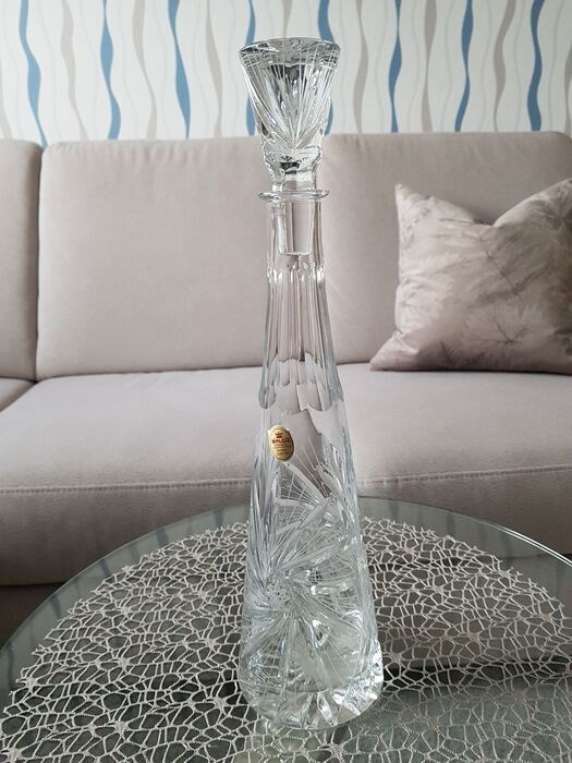 Mooie slanke karaf van loodkristal met bijpassende dop, in zeer goede staat, nauwelijks gebruikt, geen chips. De karaf is waarschijnlijk gemaakt in Duitsland of Bohemen. Hij is geschikt voor het bewaren of decanteren van wijn of likeur. Snijweergave is een ster- of wielvorm. De foto's maken deel uit van de beschrijving.