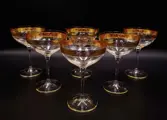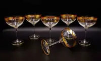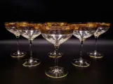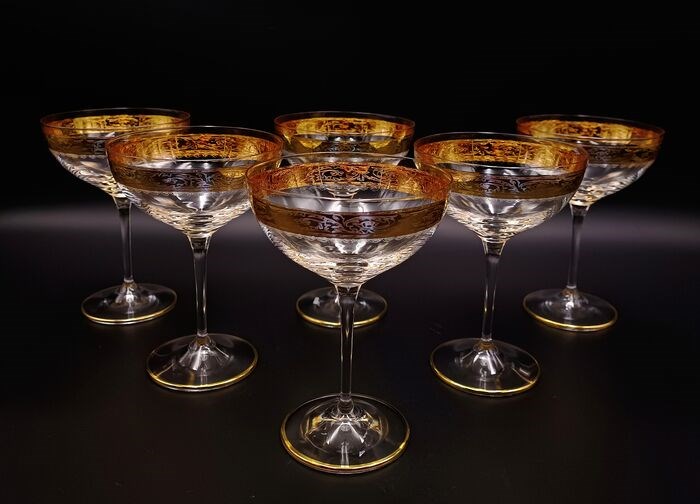 Set van 6 luxe kristallen champagnebekers, gebeitelde, mondgeblazen Vintage van SAME Cristallerie (SC Line) Crystal. Allemaal handgemaakt volgens een lang proces, afgewerkt in 24 karaat goud en gesneden met tulpenbloemen en festoenen in barokstijl met gouden afwerkingen aan de onderkant. Dit item is door meester-ambachtslieden volgens de Murano-school versierd met 100% hoog gestookt goud. De kleine gebreken die u kunt vinden, zorgen ervoor dat het product volledig handgemaakt is en de moeite waard is als kunstwerk. Elegant en tijdloos design. SC Line circa 1970.