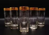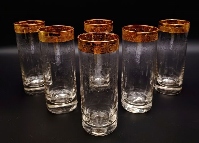 Set van 6 longdrinkglazen, water of voor je aperitieven in kristal, gebeiteld, mondgeblazen Vintage by SAME Cristallerie (SC Line) Crystal. Allemaal handgemaakt volgens een lang proces, afgewerkt in 24 karaats goud en gesneden met slingers in barokke stijl met gouden afwerkingen aan de onderkant. Dit artikel is door meester-ambachtslieden volgens de Murano-school versierd met 100% hoogbakkend goud. De kleine gebreken die je zou kunnen vinden, garanderen dat het product volledig handgemaakt is en de moeite waard is als een kunstwerk. Elegant en tijdloos ontwerp. SC-lijn omstreeks 1970.