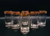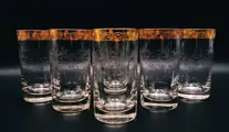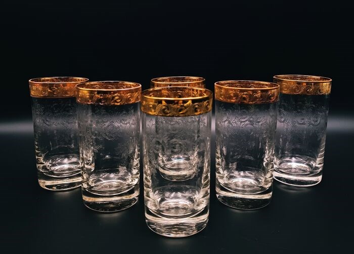 Set van 6 longdrinkglazen, water of voor je aperitieven in kristal, gebeiteld, mondgeblazen Vintage by SAME Cristallerie (SC Line) Crystal. Allemaal handgemaakt volgens een lang proces, afgewerkt in 24 karaats goud en gesneden met slingers in barokke stijl met gouden afwerkingen aan de onderkant. Dit artikel is door meester-ambachtslieden volgens de Murano-school versierd met 100% hoogbakkend goud. De kleine gebreken die je zou kunnen vinden, garanderen dat het product volledig handgemaakt is en de moeite waard is als een kunstwerk. Elegant en tijdloos ontwerp. SC-lijn omstreeks 1970.