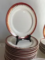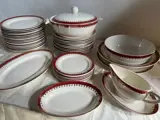 Sarreguemines, Design, Model Edwige — Schitterend en typisch Frans servies uit circa het midden van de 20e eeuw in Empire-stijl, extreem elegant!! - met overvloedige rand in Bordeaux-tint en eindstukken en decoratie - Fantastische "Greca en fleur de Lis" in briljant goud. Zeer goede staat en gebruik. U kunt details op foto's zien. Geregistreerd op de zichtbare achterkant in glanzend goud Sarreguemines et Digoin - Frankrijk model EDWIGE, merk Porcelaine Opaque en model samen met het wapen-anagram van het huis gedateerd in het midden van de 20e eeuw.