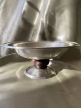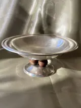 Zilverkleurige metalen beker rustend op drie rozenhouten bollen, ontwerp vergelijkbaar met het werk van Luc Lanel.