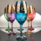 Elk glas van een andere kleur: rood, grijs, amber, blauw, groen, amethist.