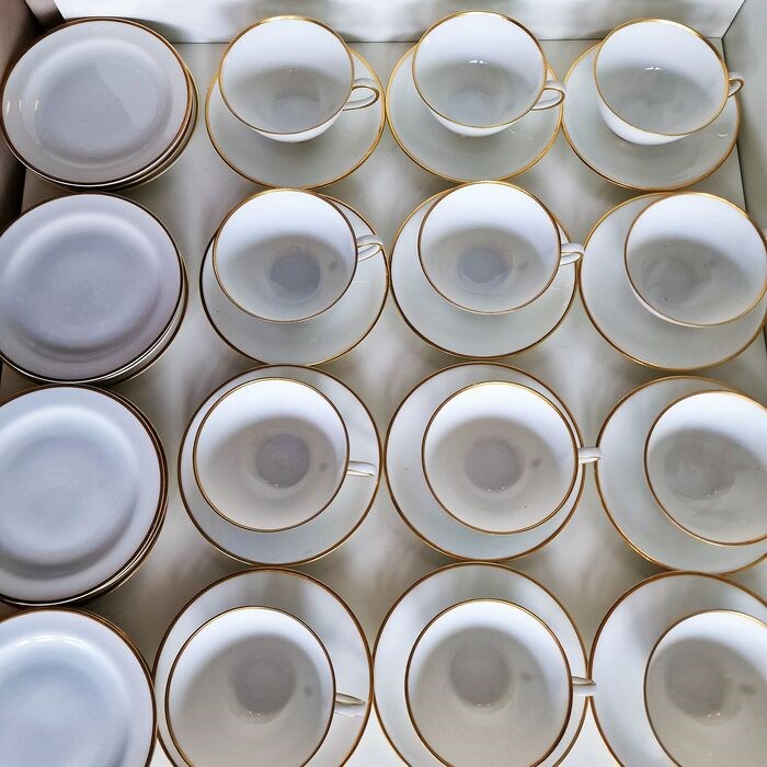 in mint conditie, met fraaie grote koppen, wit servies met goudrand, kopje staat elegant op voet rand