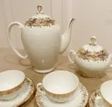 Klassiek SFP Limoges Frans porseleinen koffieservies. Witte achtergrond met gouden rand of gouden kleur.