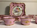 Mooi porseleinen roomservies met polychroom decor van bloemen op een roze ondergrond en verguld decor.