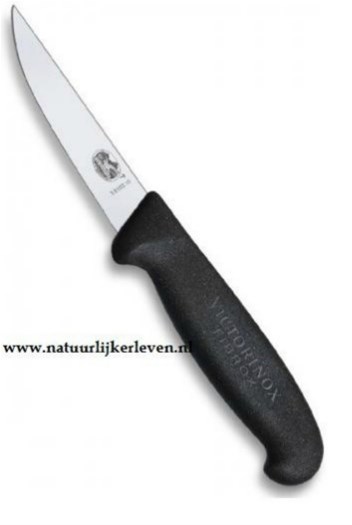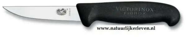 slagersmesje Victorinox: Zwitserse kwaliteit, lemmet 10 cm rvs, heft van zwart fibrox, levenslange garantie,met disposable beschermhoes.