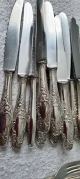wat betekend dat er 100 gram zilver is gebruikt om 12 couverts (12 tafellepels en 12 tafelvorken) te verzilveren. Het bestek is in uitstekende staat. Opde lemmeten van de messen staat‘Solingen Rostfrei’. Bestek bestaat uit 12 messen25cm. 12 kleinere messen 21 cm. 12 vorken 22 cm. 12 kleinere vorken 19 cm. 12 gebak vorken12 lepels 22 cm.12 koffie of dessert lepels. Let op 1 lepel heeft kleine beschadiging. Zie foto's. Totaal 84 delen. Zie foto's voor details. Wordt per aangetekende verstuurd.