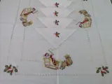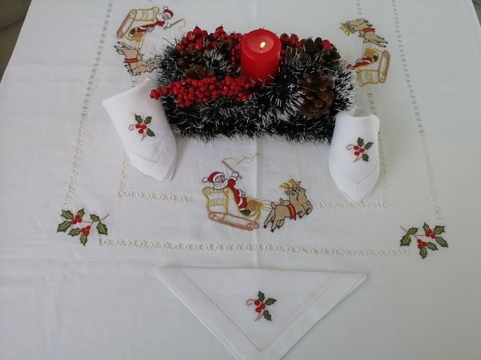 Spectaculair!! Kersttafelkleed x 12 (inclusief 12 linnen servetten) in het zuiverste linnen met full stitch handborduurwerk.