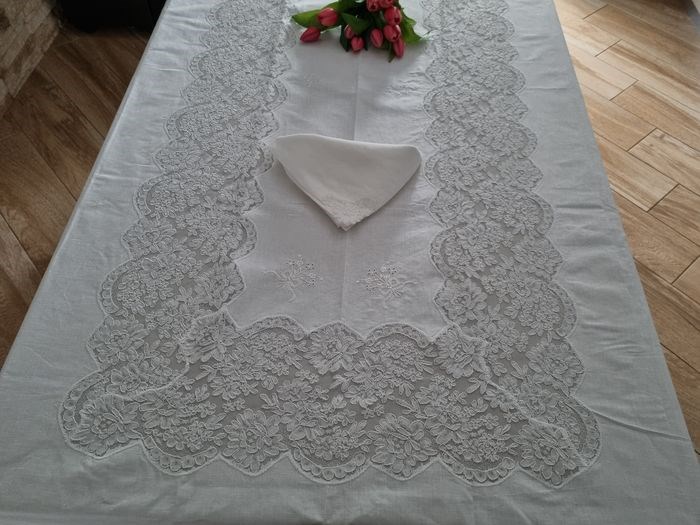 Betoverend tafelkleed x12 (met 12 servetten) in puur linnen van zeer hoge kwaliteit met Frans Rebrode'-borduurwerk en handsatijnsteek