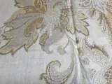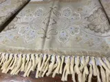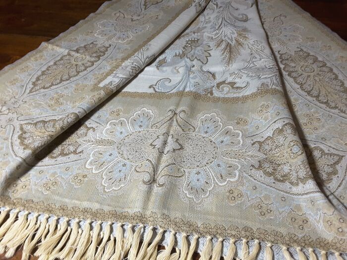 Afkomstig uit India handgemaakt op een weefgetouw zoals de tapijten met prachtige arabeske ontwerpen in blauwe kleuren op een goudbeige achtergrond