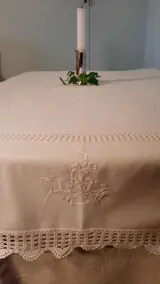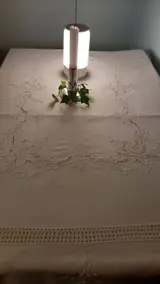 Tafelkleed, puur katoen, effen wit, met romantische, kostbare broderie en mooie gehaakte randen. Hoge kwaliteit, bijna nieuw, geen gebreken.