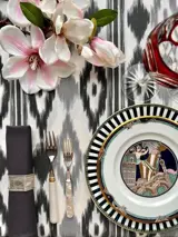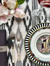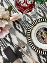Tafelloper tafelkleed met ikat print in zwarte en grijze kleuren op een canvas stof van een uitzonderlijke kwaliteit met een dessin.