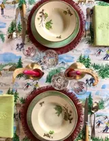 Tafelkleed en vier bijpassende servetten, in ongemengd natuurlijk canvas, met een aangename textuur, met een indrukwekkende print die besneeuwde landschappen en skigebieden nabootst, perfect om elk servies te verfraaien.