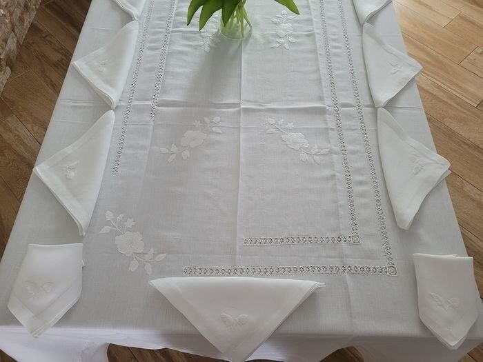 Elegant tafelkleed x 12 (inclusief 12 linnen servetten) in 100% puur linnen met handgeborduurde lelie en satijnsteek>N.B. op de foto in de galerij ziet u het omgekeerde borduurwerk dat de authenticiteit van het handwerk aangeeft.