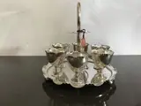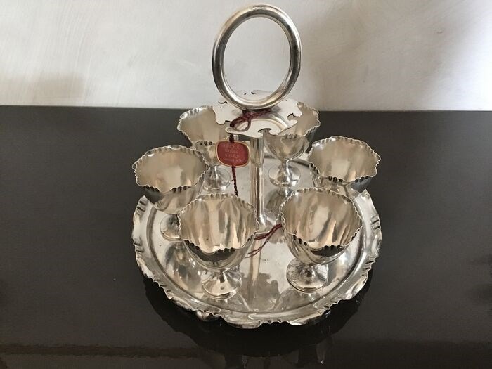 De set bestaat uit een dienblad met een centraal handvat en zes eierdopjes.