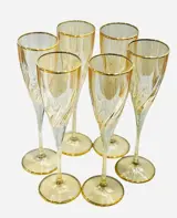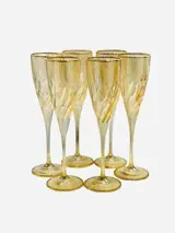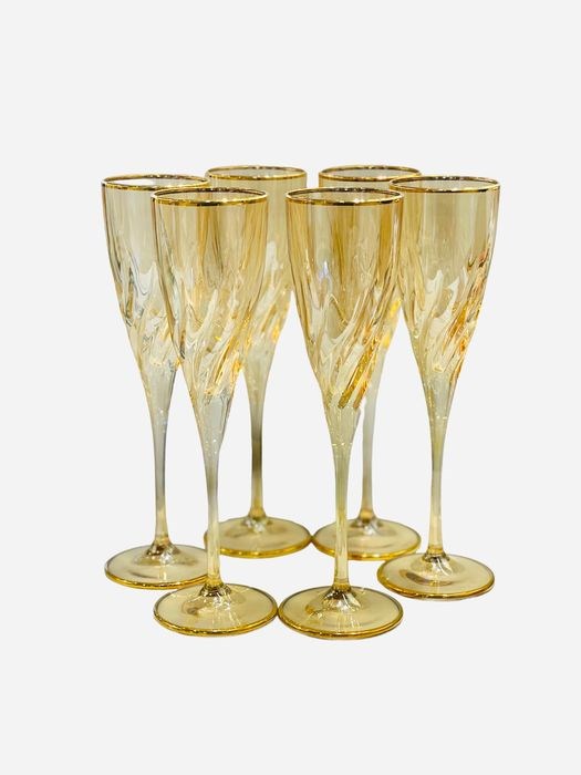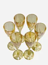 6 glazen ontworpen en geproduceerd voor Vetromania in Italië en met de hand gedecoreerd door de Zecchin-glasfabriek met gekleurd email en 24 kt goud, perfect volgens de oude techniek van Murano-glasdecorateurs.