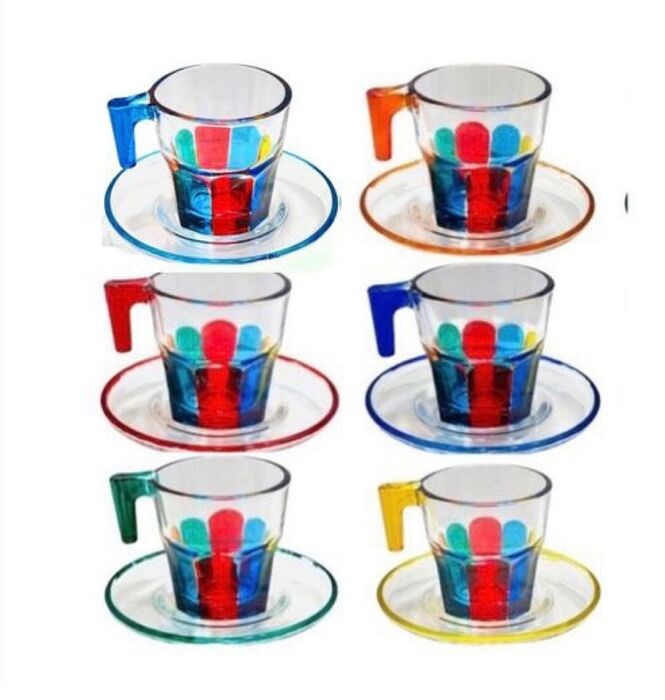 6 koffiekopjes geproduceerd voor Vetromania in Italië en met de hand gedecoreerd door de Zecchin-glasfabriek met gekleurd email, perfect volgens de oude techniek van Murano-decorateurs.