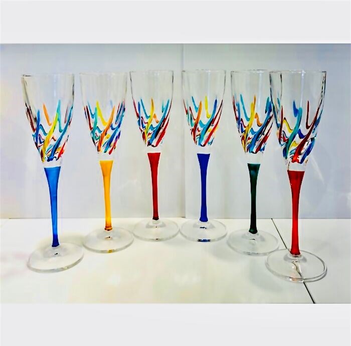 6 glazen ontworpen en geproduceerd voor Vetromania in Italië en met de hand gedecoreerd door de Zecchin-glasfabriek met gekleurd email volgens de oude techniek van Murano-glasdecorateurs tot in de perfectie.