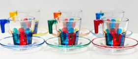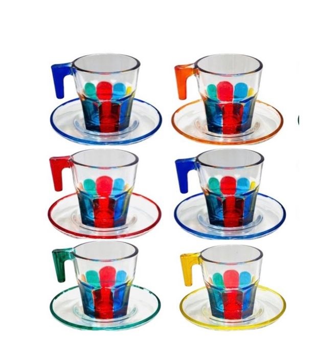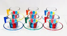 6 koffiekopjes geproduceerd voor Vetromania in Italië en met de hand gedecoreerd door de Zecchin-glasfabriek met gekleurd email, perfect volgens de oude techniek van Murano-decorateurs.