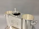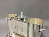 Verzilverde koeler voor 2 wijnflessen, met houder voor ijsblokjes in het midden. Aan de zijden gegraveerde wijnetiketten (2fl7).
