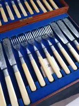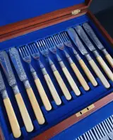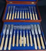 24-delige visbestekset, victoriaans verzilverd, helder geslepen gegraveerd patroon, massief pyralin creme handvat, originele mahoniehouten bestekkoffer. Wat lichte plaat slijtage. uitstekende kwaliteit en staat.