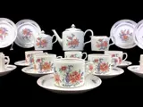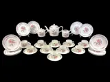 Theeservies voor 10 personen verrijkt met 10 dessertschotels, van de prestigieuze Portugese porseleinfabrikant Vista Alegre. Het servies is geheel met de hand gedecoreerd met bloemmotieven in roze tinten in contrast met diepblauwe bladeren en vazen. De handvatten zijn in ineengestrengelde banden. Aandacht voor detail staat altijd voorop bij dit beroemde en luxueuze porseleinmerk.