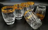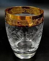 Set van 6 kristallen glazen, gebeiteld, mondgeblazen, vintage door Cre Art Srl "Allegro" model met San Marco decoratie, opgericht in 1968, gelegen in de provincie Florence daterend uit het einde van de 20e eeuw. Een van de beste Toscaanse producenten. Zeer zeldzaam en zeer gewild. Allemaal handgemaakt en afgewerkt in 24 karaats goud in de bovenrand, bewerkt met slingersnijwerk in het midden. Een uit duizenden. Dit item is met de hand gedecoreerd door meester-ambachtslieden met 100% hoogbakkend goud. Goed voor Scotch, Whisky en andere prestigieuze sterke dranken. Afmetingen: hoogte 11 cm - diameter 7,6 cm.