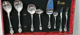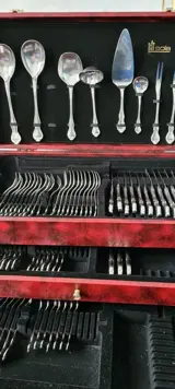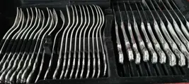 In 1927 introduceert WMF een RVSmateriaal onder de term Cromargan dat roestvrij en onbreekbaar is. Dof wordt het materiaal ook niet. Bestek is in goede maar gebruikte staat en bestaat uit 9 vorken 19 cm 9 vorken 18 cm 9 lepels 20 cm 8 lepels 19 cm 6 messen 21 cm 9 messen 20 cm 11 gebak vorkjes 7 koffie lepeltjes en 8 opdien bestek. Totaal 76 delen. Cassette is niet origineel. Zie foto's voor details. Wordt per aangetekende verstuurd.
