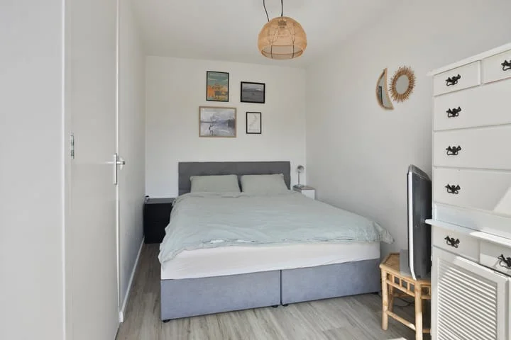 Indeling: Lichte woonkamer met zijraam, open keuken met inductiekookplaat, afzuigkap, combimagnetron, koelkast en vaatwasser, moderne badkamer met inloopdouche, dubbele wastafel en grote spiegel, 2 slaapkamers (grootste met toegang tot dakterras)