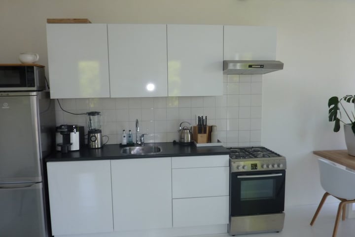 • Indeling: Hal, bergruimte met CV-ketel en wasmachineaansluiting, toilet met fonteintje, badkamer met wastafel, tweede toilet en douchehoek, woonkamer met toegang tot terras, open keuken met afzuigkap