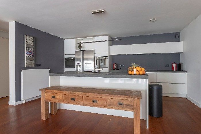 Keuken: Door middel van het spoeleiland met vaatwasser, wordt de woonkamer mooi afgescheiden met de open keuken. De echte eyecatcher in deze keuken is de "Amerikaanse" RVS koelkast met dubbele deur. Met de speciale dispenser voor koud water en ijsblokjes wordt je glas met 1 druk op de knop gevuld, voor heerlijke verkoeling! Alle gewenste inbouwapparatuur vind je terug in de achterwand van deze keuken. Net zoals de woonkamer is ook de keuken volledig vernieuwd in 2015.