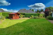 Bijgebouwen: inpandige garage, houten tuinhuis (blokhut)