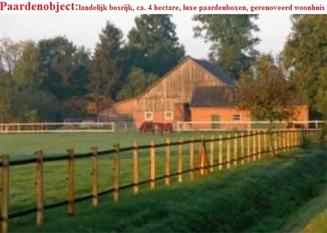 Referentienr. IM-1509005. Paardenhouders opgelet !! Puur landelijk gelegen woonboerderij met luxe paardenboxen, schuren, meerdere hectares paardenwei en gerenoveerd woonhuis, te midden van een schitterend bosrijk landschap. Gunstig gelegen nabij luchthaven en autobaan in diverse richtingen Nederland.