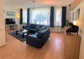 De woonkamer is verdeeld in een zithoek met t.v. gedeelte en een eethoek bij de open keuken.