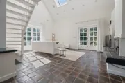 De woonkamer is erg ruim van opzet en meet ca. 60 m2. Dit vertrek is op een speelse manier ingedeeld met een salon en een huiskamer. Deze beide vertrekken worden van elkaar gescheiden door de open houten trap naar de vide op de verdieping. Dan is er nog een verscholen, open verbinding met de keuken. Wanneer u daar bezig bent heeft u toch contact met de mensen in de woonkamer.