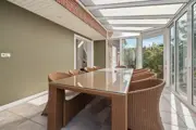 De serre is een plekje waar je het gevoel hebt in de tuin te zitten. De ramen tot op de grond geven een fantastisch uitzicht op de tuin. Het licht doorlatende dak maakt deze serre tot een heerlijk “buitenplekje” waar u kunt genieten van de avondzon. Er is een schuifpui naar de tuin en ook in de serre is er gezorgd voor heteluchtverwarming en er is ingebouwde verlichting.