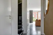 Via de voortuin komen we binnen in de hal. Links is de uitgebreide meterkast (13 groepen, glasvezelaansluiting en het stadverwarmingssysteem), de toiletruimte met zwevend toilet, fonteintje en inbouwspot en de trapopgang naar de 1e verdieping. Vóór ons is de toegang tot de riante woonkamer met een prettige lichtinval, door de grote raampartijen, openslaande deuren en het zijgevelraam. Vanuit de zithoek hebben we zicht op de groene achtertuin en het water.