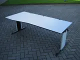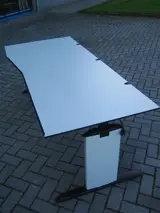 Beeldschermbureau Lensvelt Rechts, volkern blad: l.grijs, hoogte instelbare T-poten: wit met zwart, vzv. kabeldoorvoer inkeping in blad (zie foto)