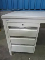 Bureautafel Mibra, 4-poot frame (demontabel), blad met lichte beschadiging, hangend 3-ladeblok met 3 laden A6, zonder sleutel, lichtgrijs